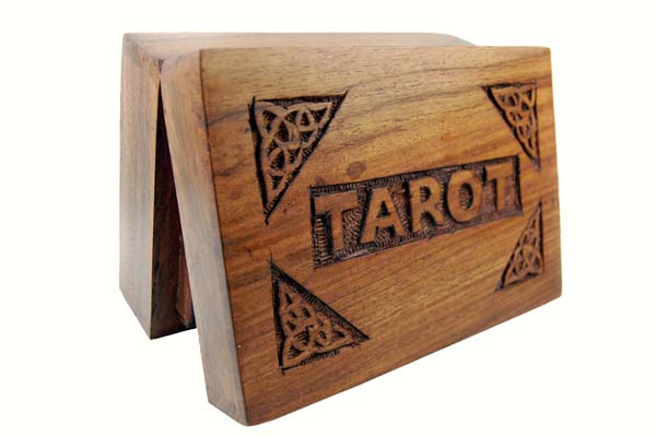Ξύλινο κουτί - θήκη για τράπουλες ταρώ με σκαλιστή διακόσμηση στο καπάκι του.